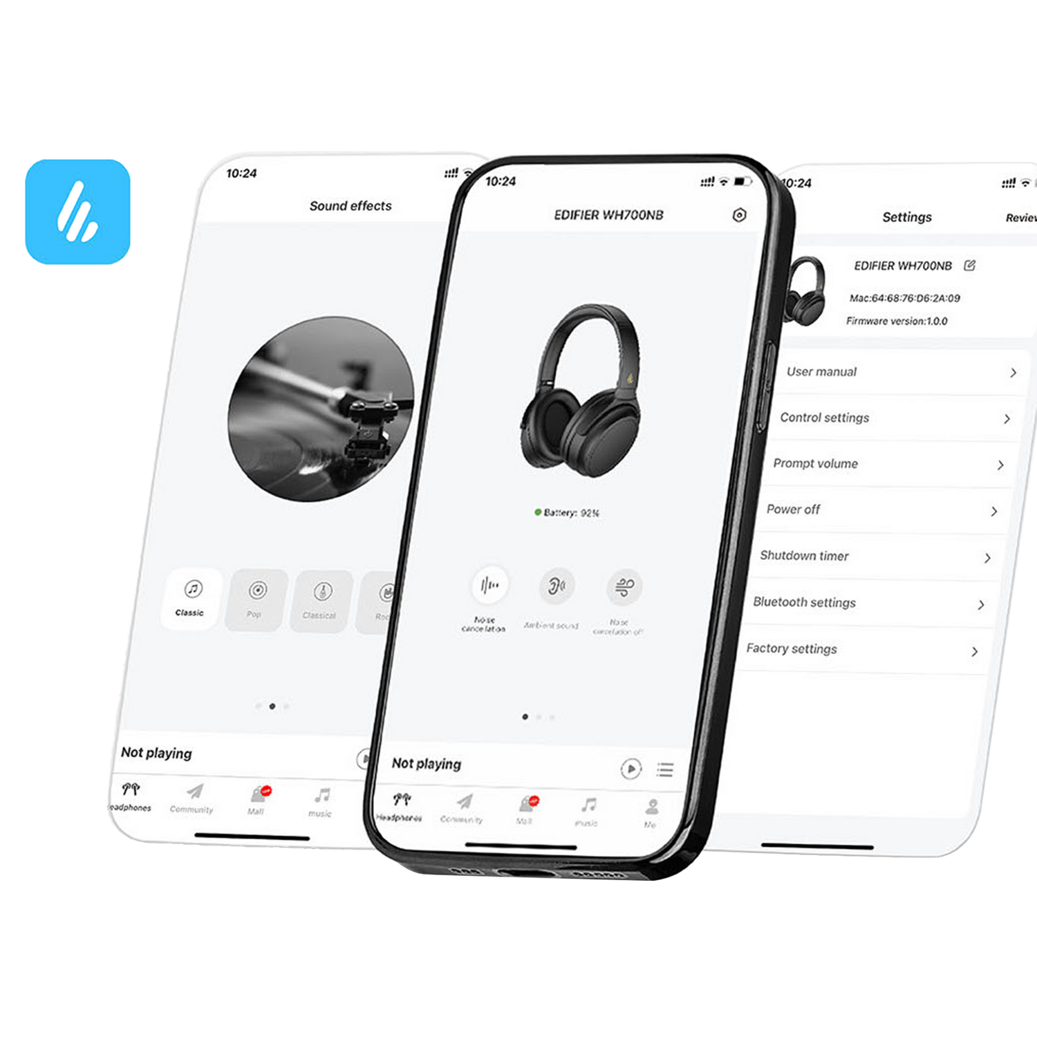 Greifen Sie auf 4 voreingestellte EQ-Einstellungen, beruhigende Klänge, anpassbare Tastenkonfigurationen und mehr zu.
