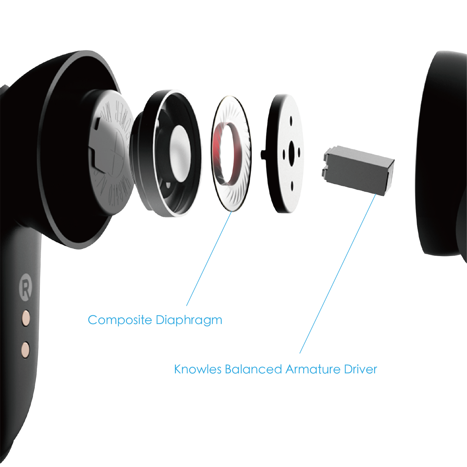 El controlador dinámico de diafragma compuesto y la armadura equilibrada de Knowles constituyen una estructura acústica única. La armadura equilibrada, que presenta alta sensibilidad y resolución excepcional, ofrece un sonido brillante de alta frecuencia, mientras que el controlador dinámico proporciona unos graves vigorosos, sólidos y naturales.