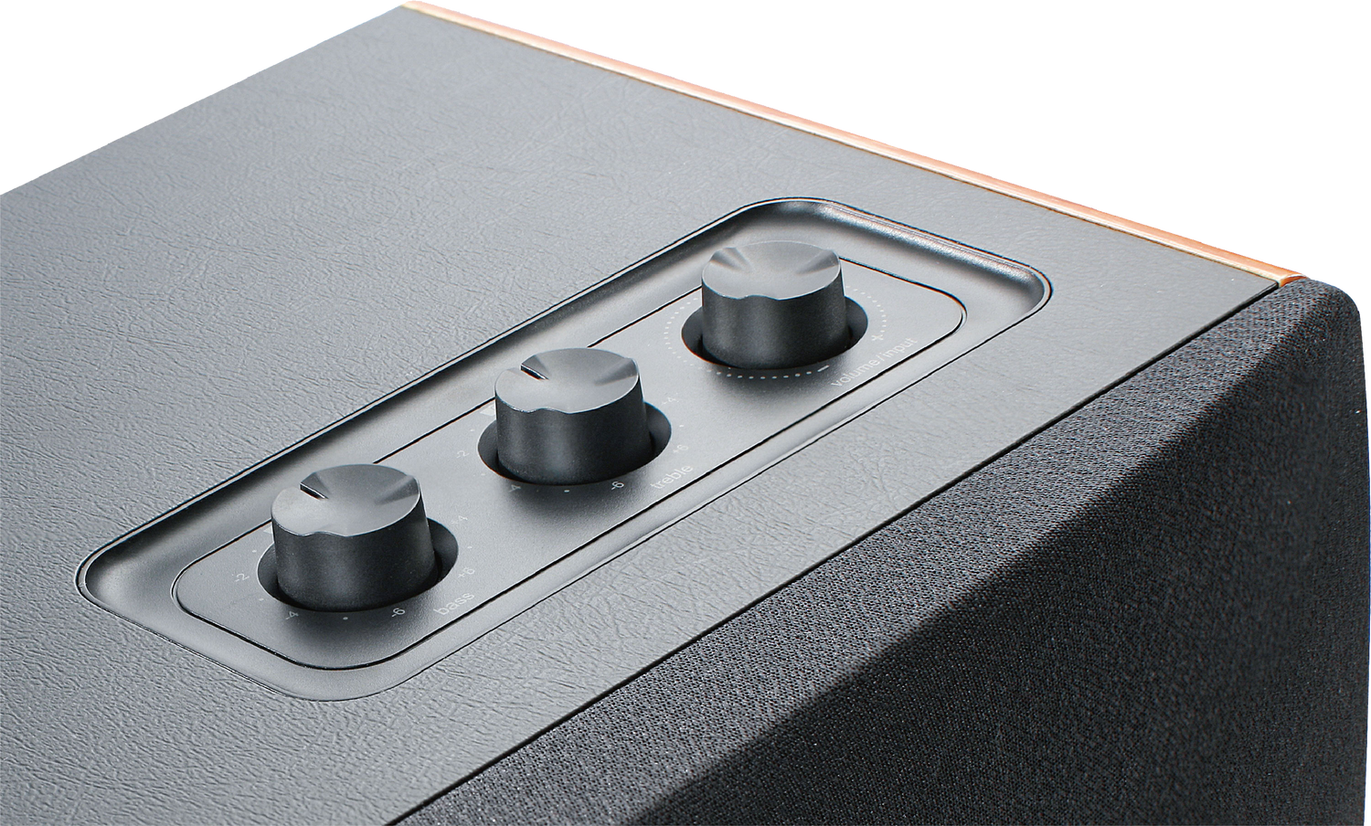 Trois boutons montés sur le dessus (cadran des basses, cadran des aigus, contrôle du volume/sélecteur d'entrée) permettent un contrôle simple et précis des aigus, des basses et du volume/entrée.