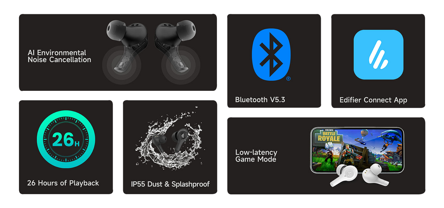 Prova fino a 6,5 ore di riproduzione con una singola carica e un totale di 26 ore con la custodia di ricarica. Una ricarica rapida USB-C di 10 minuti fornisce un'ora aggiuntiva di riproduzione. Il pannello di protezione NTC integrato disconnette automaticamente l'alimentazione quando la batteria è carica per evitare il sovraccarico.