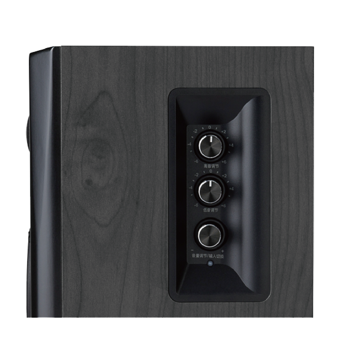 Assumi il pieno controllo del tuo audio con i controlli del pannello laterale sul lato di uno degli altoparlanti da scaffale. Sul lato si trovano tre manopole che influenzano i bassi, gli alti e il volume dell'intero sistema 2.1. Una volta acceso, apparirà la spia di alimentazione per farti sapere che il tuo sistema sta funzionando.