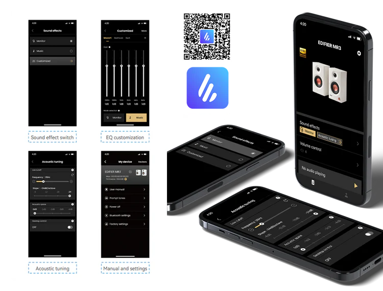 Le manopole posteriori e l'app EDIFIER ConneX offrono molteplici impostazioni per la compensazione acustica della stanza, permettendoti di adattarti a diverse modalità ambientali e ottenere l'esperienza d'ascolto ottimale.