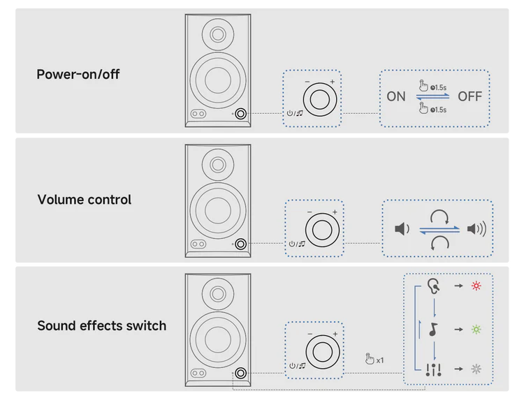 Una manopola multifunzione sul pannello frontale consente di accendere/spegnere, regolare il volume e cambiare gli effetti sonori.